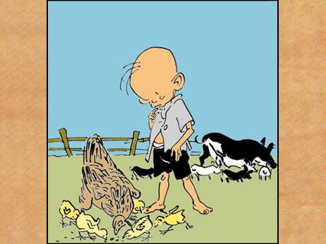 喂小鸡。母鸡咕咕,小鸡唧唧,多快乐呀!三毛看呀看呀,他又