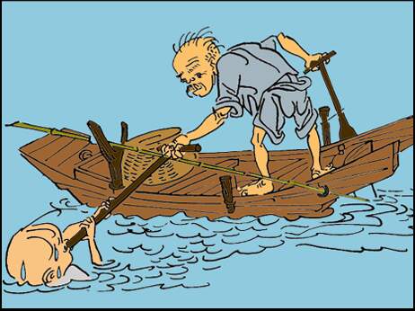 桨伸给三毛,三毛赶紧抓住了船桨,老爷爷用劲一拉,就把三毛