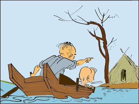 老爷爷划着小船到了河对岸, 他指着河岸上搭的一个草棚