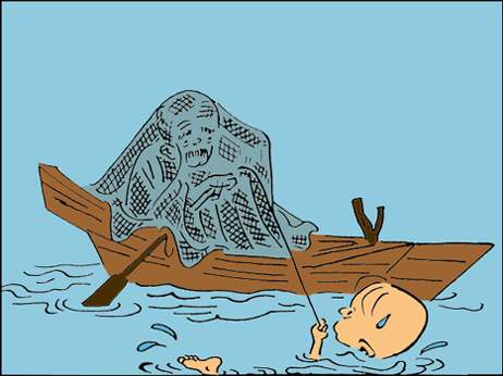 那只大网呀,你猜怎么着?没撒到河里,倒甩到了老爷爷头