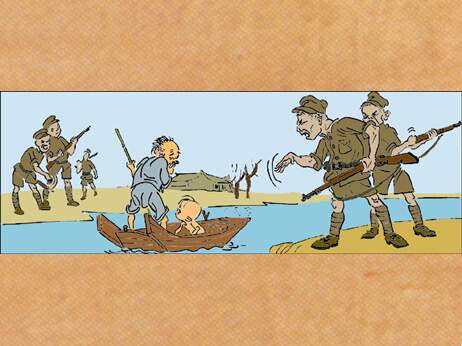 老爷爷站在小船上, 看看两岸的大兵都扛着枪, 一下子呆