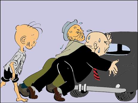还是那辆汽车。原来车抛锚了。那两个家伙费劲地推着汽车,瘦
