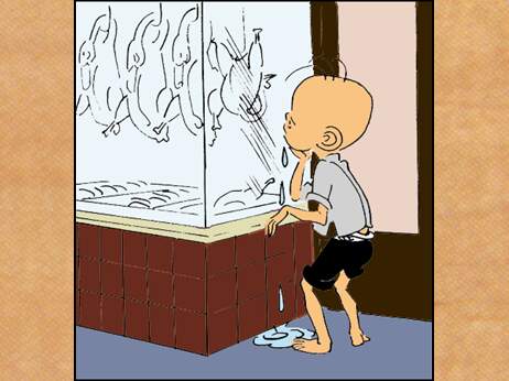 的烧鸡和薰肉,可三毛只能干看着,吃不上,口水滴了一地。