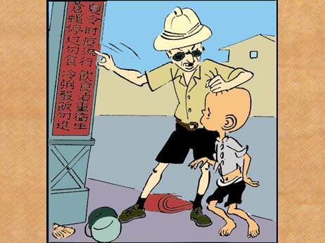 贴标语的人气汹汹地揪着三毛的三根头发, 指着标语说: