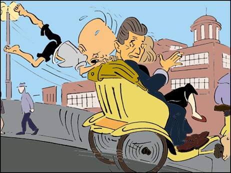 蓬架子不撒手。 车下得太快了,三毛脚底下跟不上,两腿悬空,