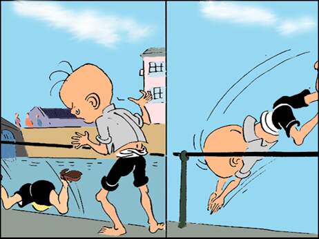水里。站在一边的三毛看见了,就赶紧一纵身,从栏杆上一个猛