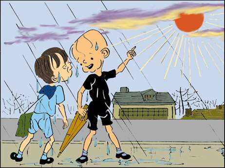 穿着又湿又脏的衣服怎么去学校呀!俩人正犯愁,云彩缝里
