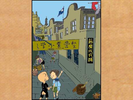 上边写着“私立营业小学”。紧挨学校是一家成衣铺子。小弟指