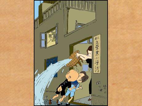 三毛跟着小弟刚走到校门口,一个胖大婶端着盆水,冷不丁