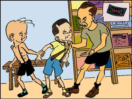 也得给钱!”说着就拽住小弟,伸手要掏小弟的兜儿。三毛一边