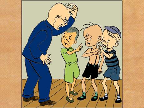 老校长捂着头走进教室问他们仨,“谁扔的?”三个小家伙