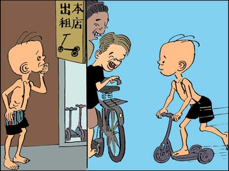 三毛忽然看见有一家店出租小孩玩的小车。心想,蹬上它也