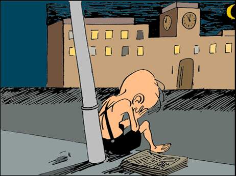 天黑了,三毛坐在马路边的电线杆底下,路灯照着三毛身边