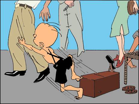三毛来到一条热闹大街上, 这儿人多。 他支好摊,准备揽
