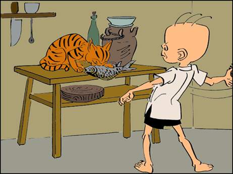 三毛把鸡轰走了,拣回菜来一看,鱼不见了。只见一只猫正