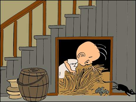 “嗖”地一声从稻草里窜出一只老鼠。三毛借着楼道灯光再往里