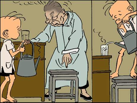 老板想喝水,叫三毛沏茶。三毛赶紧到厨房提来了开水壶。