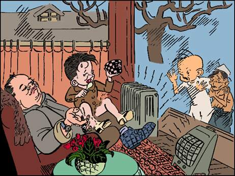 三毛走到一家有钱人的屋外边,隔着大玻璃,看见屋里的胖