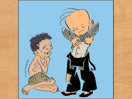穷孩子也光着身子,冻得坐在地上直哭。好心的三毛又脱下身上