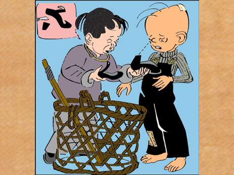 三毛拣烟头跑的路多了,脚掌磨起了水泡。他没有鞋穿呐!