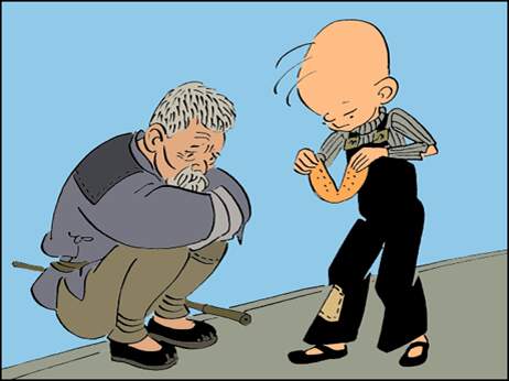 三毛搀着老爷爷过了马路,老爷爷往墙上一靠直喘粗气。三