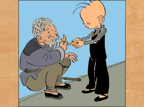 老爷爷接过大饼,三口两口就吃了下去。三毛见他实在太饿