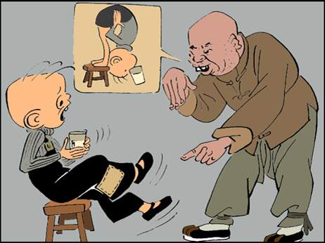 三毛挨了摔,师父还叫他练腰功。师父让三毛在小凳上练下