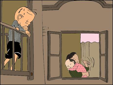 里还亮着灯。一位妈妈正抱着自己的娃娃在哄睡觉。三毛看得好