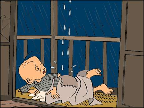 来是小雨从廊子外边潲进来, 滴在了三毛身上, 不是妈妈的泪
