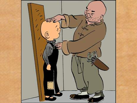 师父说:“甭害怕,我扔得准着呢,伤不着你!”三毛半信