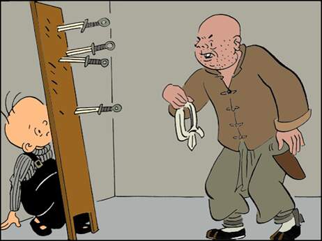 咚!”扔了两把刀,扔完后,解开蒙眼睛的布一看,咦,三毛哪