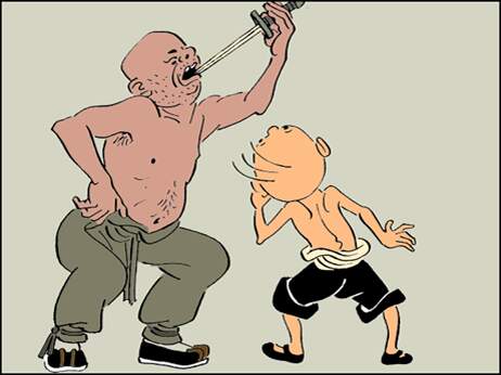 三毛的师父还有吞尖刀的本领。他仰着头,举着尖刀往张开