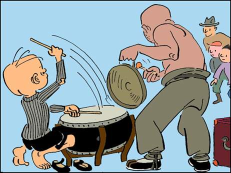 师父敲锣,三毛打鼓。师父一边敲着锣,还一边吆喝:“这