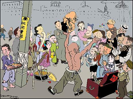 师徒俩就这样,天天在街头卖艺耍把式。又到了四月四日儿 童节了,街上人多孩子多。一大早,三毛和师父刚支好摊,还没 敲锣打鼓,就围了一大圈子人。他们一看来了这么多人,心里很 高兴。 看热闹的人里小孩最多啦,有妈妈抱着的,有骑在爸爸肩上 的。小女孩搂着玩具洋娃娃,小男孩拉着小坦克车玩具,他们一 边看,一边还吃着彩果、饼干什么的。 三毛和师父把所有的把戏都耍过了,最后表演的是“单手托 举”。师父光着上身, 举着右胳臂, 左手托着用绳捆起来的三 毛。三毛被绳子捆住双手和双腿,变得像个大虾米。师父的大手 托在三毛的肚子上,三毛憋得直流泪。 街上有个柱子, 上边贴着一条标语, 写着 : “ 庆祝 ‘四·四’儿童节”。柱子旁边,有个卖大饼油条的穷孩子,他 侧着脸不忍心看三毛受这份罪。 |