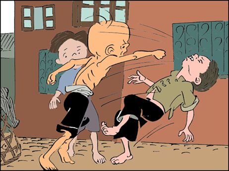往筐子上一摔,一拳就把那孩子打了个仰面朝天,半天起不来。