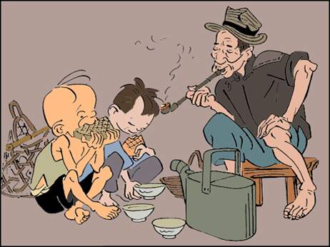 三毛拿了钱要请阿根吃顿饭。他们走到一个卖大饼和茶水的