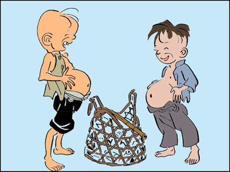 也喝光了。两个人站起来,相互一瞧,嘿!肚子都圆鼓鼓的了。