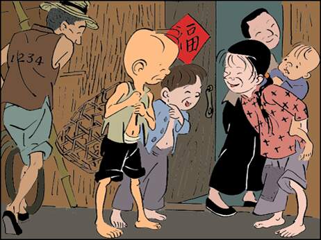 站着一个大姐姐,穿着打了补丁的花小褂,光着脚。大姐姐身后