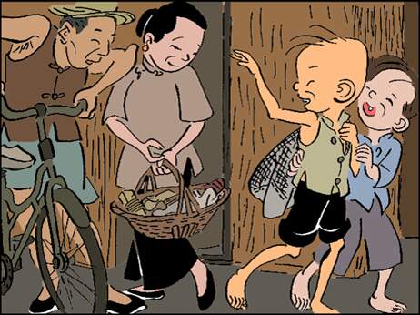 客。刘大妈提着篮子出去给人家缝补。 阿根姐看家, 照看小弟