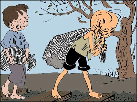 上,阿根抱一个小的,高高兴兴回家了。三毛走在前,阿根跟在