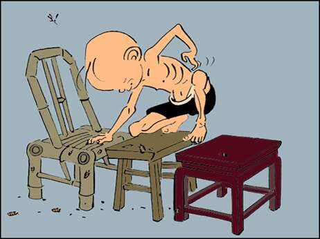 天黑了, 三毛用两个小木凳和一把小竹椅搭了个小床。 他