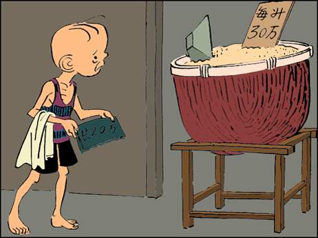 店一看,米筐子上的木牌写着“每升米30万元”。米涨价了。三