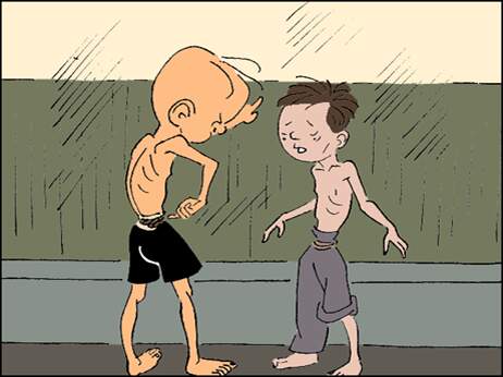 三毛他俩看着那个吃得满嘴流油的胖子,又看看自己勒得那