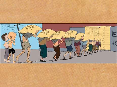 些扛大包儿的搬运工人,肩膀上扛着一百斤重的大米包,送进阔