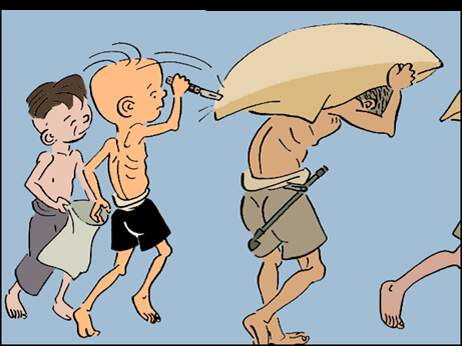 和阿根恨透了他们,俩人跟在扛米的工人后边,悄悄地用小刀把