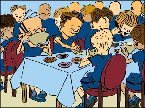 上午上完课,他们就去吃午饭。饭厅里小朋友都坐在长条桌
