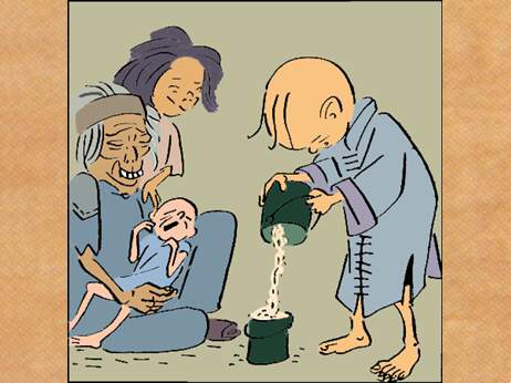 小铁桶里的东西全倒在了小女孩的罐子里,冲老奶奶点点头,愧